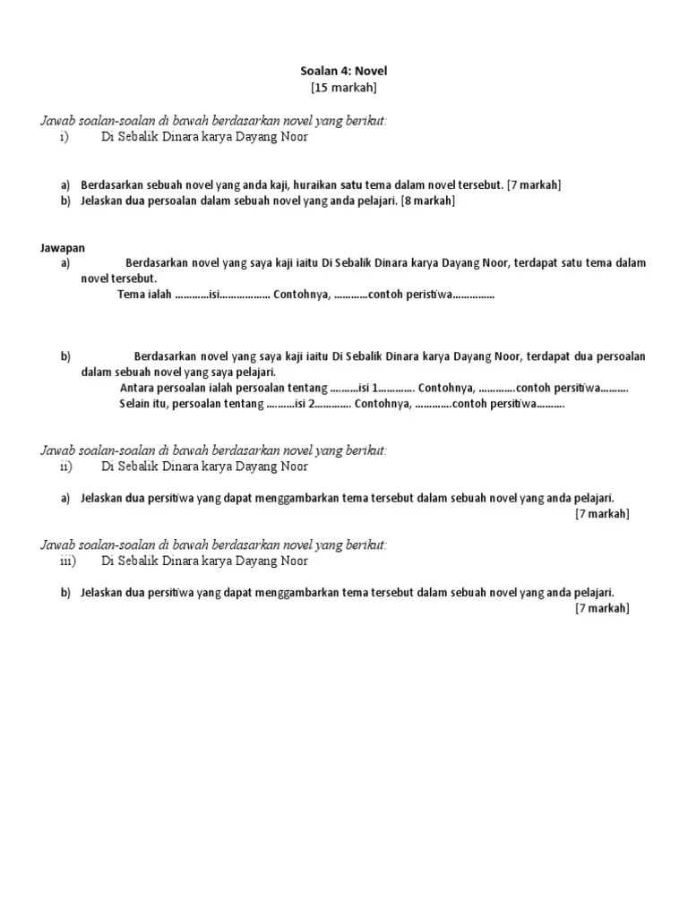 Penguasaan teknik menjawab soalan komsas, tatabahasa dan bm kertas 1/spm novel tingkatan 4 di sebalik dinara. Novel yang telah saya pelajari di tingkatan 4 ialah novel di sebalik dinara, karya dayang noor.
